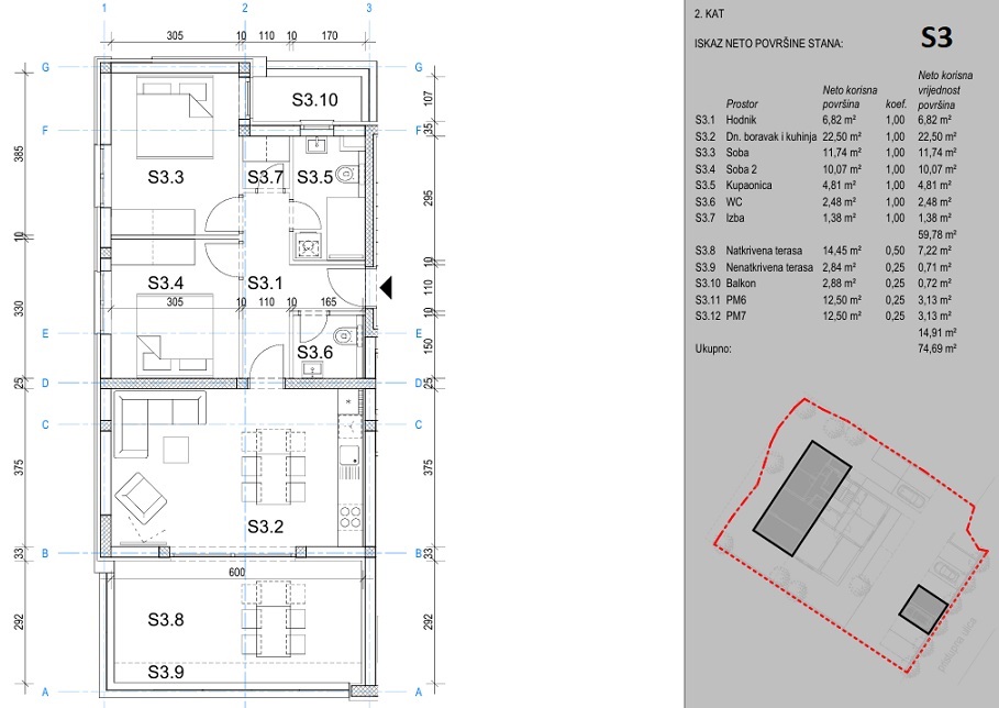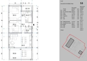 Na predaj je trojizbový apartmán (S3) s celkovou rozlohou približne 74,69 m2 na druhom poschodí novostavby v Novalji.